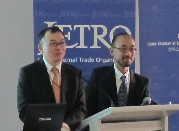 セミナーでは、在オーストラリア日本国大使館の田辺雄史参事官、ジェトロ・シドニー事務所の平木忠義調査部長から、オーストラリアの経済概況と在豪日系企業の活動状況、TPPの概要を含む最近の日豪関係などについて説明を聞いた。
